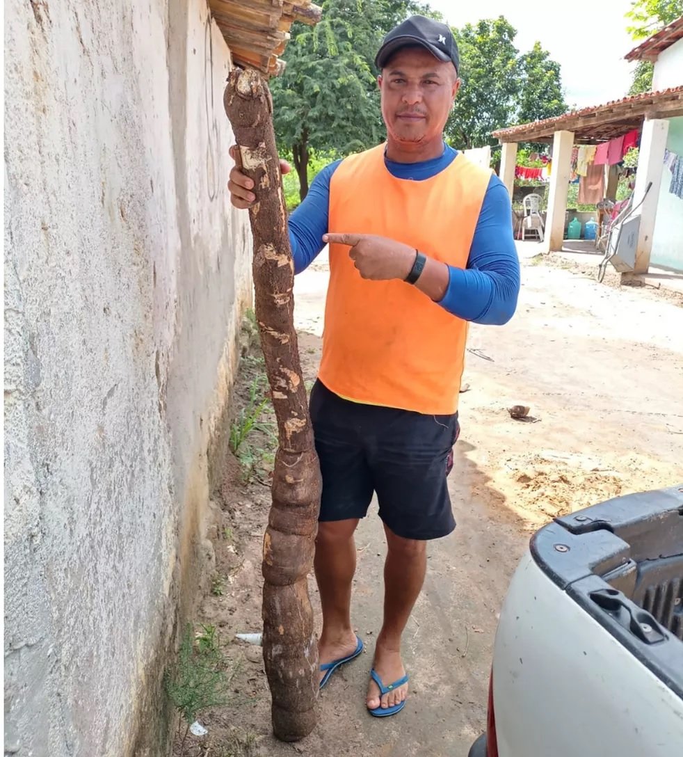 Um agricultor colheu duas mandiocas, uma de dois metros e quase 30 quilos e outra com 1,5 metro, no distrito de Matinha, na zona rural de Feira de Santana. “Minha esposa foi arrancar essa mandioca para fazer farinha e a gente se deparou com essa raiz gigante”, disse Francisco Paulo Santos Ferreira, 46 anos.