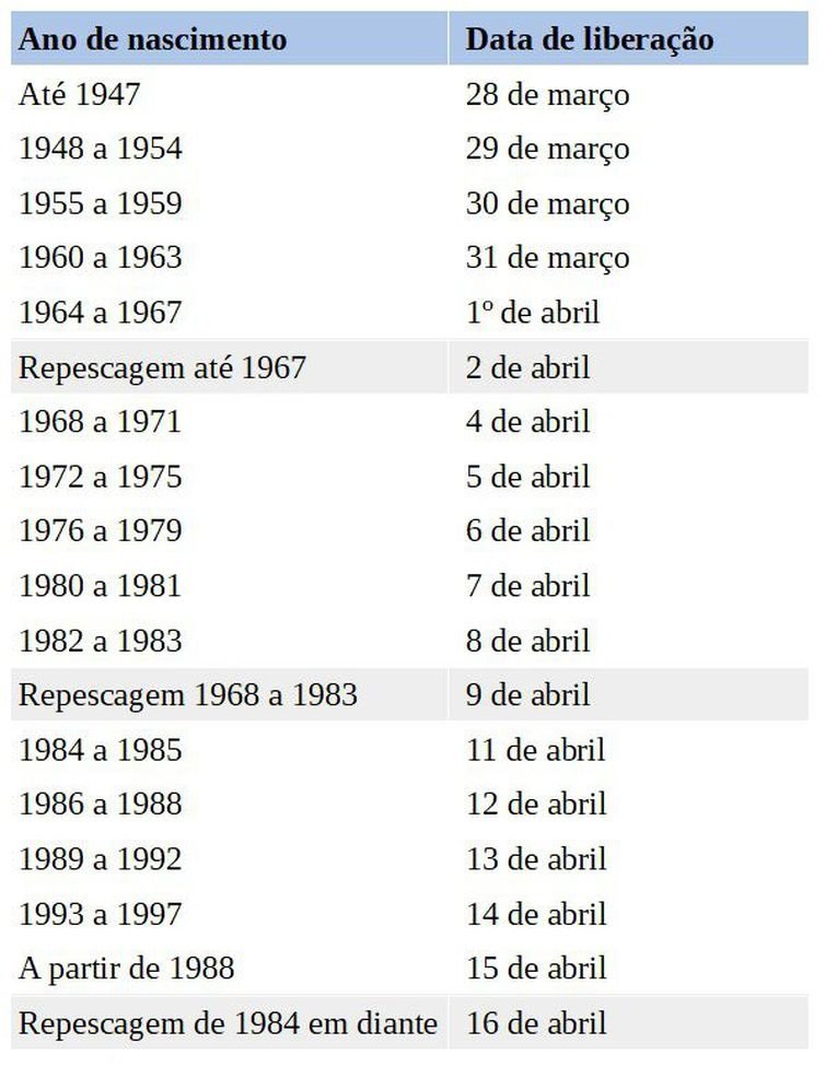 O BC mudou as regras de pagamento e divulgou novo calendário para agendar as retiradas, em etapas escalonadas conforme o ano de nascimento. Assim como nas últimas semanas, aos sábados haverá repescagem dentro da repescagem para quem perdeu a chance do agendamento.