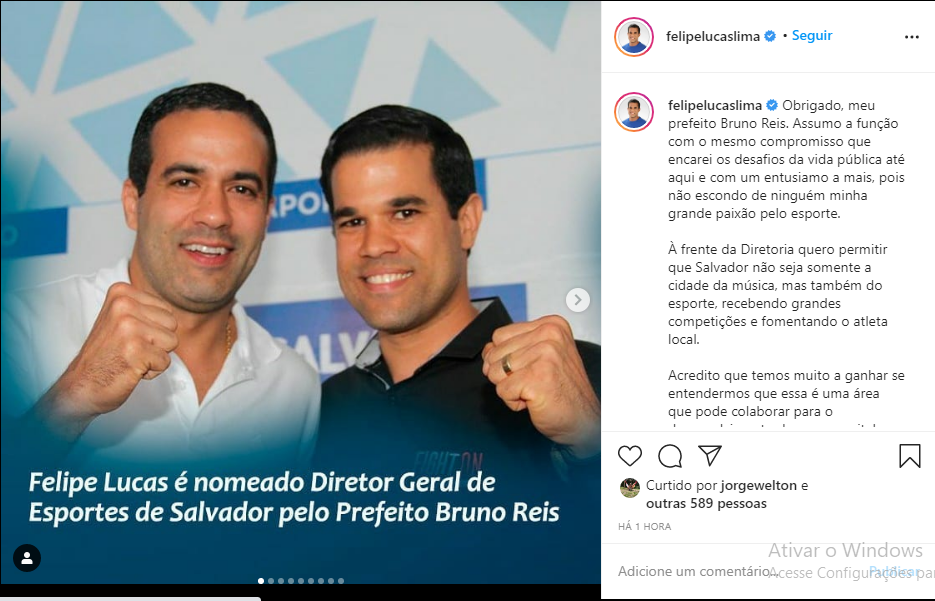 “Obrigado, meu prefeito Bruno Reis. Assumo a função com o mesmo compromisso [com] que encarei os desafios da vida pública até aqui e com um entusiamo a mais, pois não escondo de ninguém minha grande paixão pelo esporte… Acredito que temos muito a ganhar se entendermos que essa é uma área que pode colaborar para o desenvolvimento da nossa capital, gerando saúde, inclusão social, fomento ao turismo e a economia através dos eventos esportivos”, afirmou Felipe no Instagram.