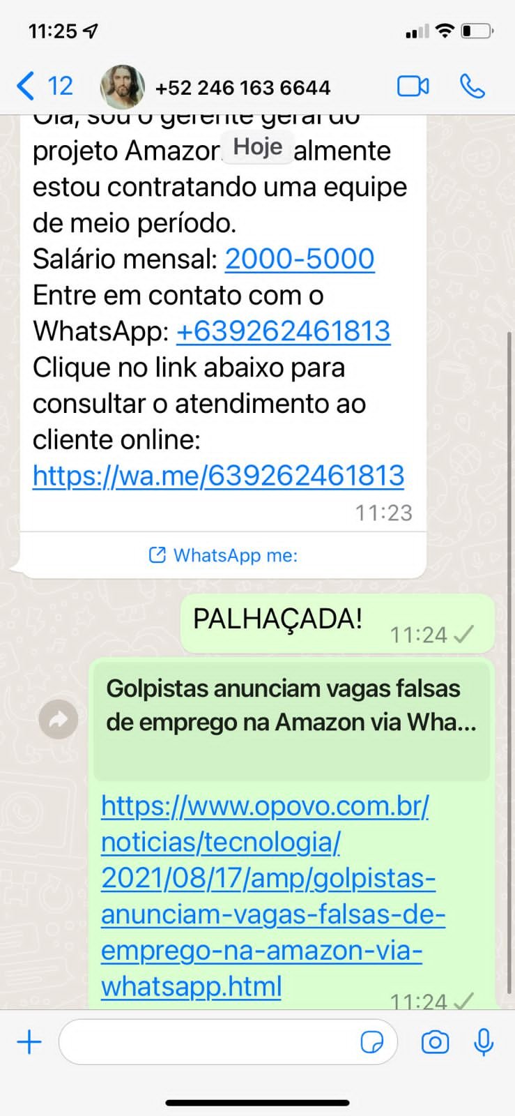 Nesta segunda-feira (16), várias pessoas relataram o recebimento de mensagens de um suposto gerente de marketing da empresa Amazon, por meio do WhatsApp, no qual informa um suposto recrutamento de equipe para trabalhar na multinacional de tecnologia. De acordo com O Povo, a empresa informou que não utiliza o aplicativo para divulgação de ofertas de emprego.