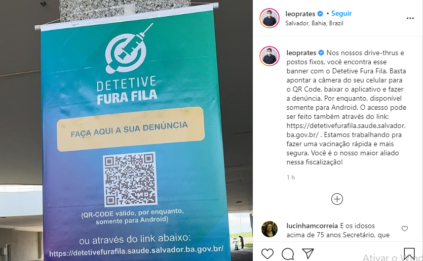 A informação foi divulgada pelo secretário municipal de Saúde, Leo Prates. “Nos nossos drive-thrus e postos fixos, você encontra esse banner com o Detetive Fura Fila. Basta apontar a câmera do seu celular para o QR Code, baixar o aplicativo e fazer a denúncia. Por enquanto, disponível somente para Android. O acesso pode ser feito também através do link: https://detetivefurafila.saude.salvador.ba.gov.br/”, informou o secretário no Instagram