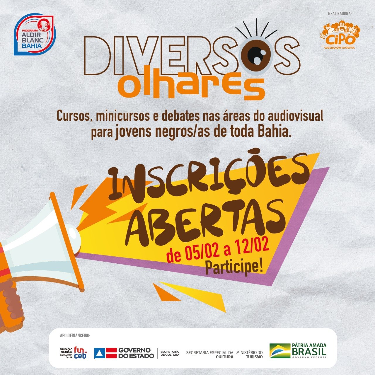 O projeto Diversos Olhares abre inscrições gratuitas para os cursos, minicursos e debates sobre cinema negro. As inscrições vão de 05 a 12 de fevereiro e estão destinadas ao público jovem negro de Salvador e Região Metropolitana.