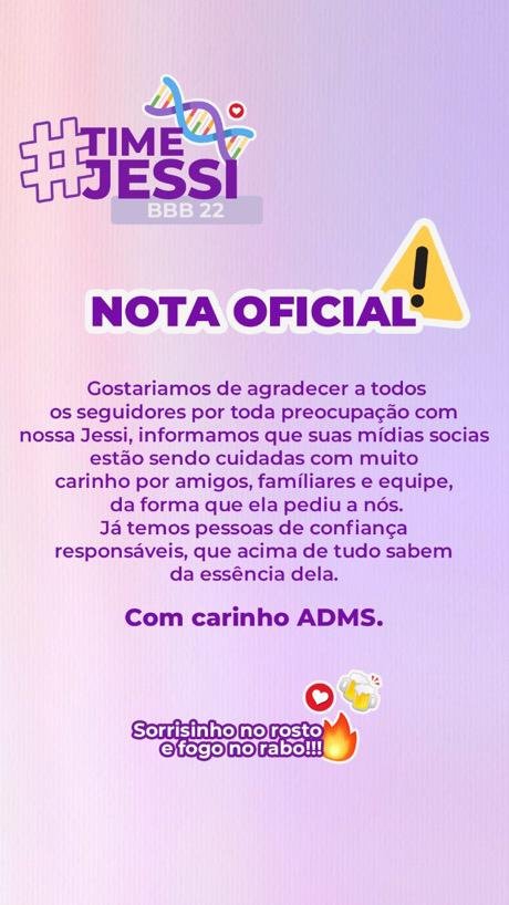 Adm passando rapidinho para acalmar o coração de vocês. Pedimos acima de tudo paciência! Entendemos que querem o melhor da Jessi! Mas vai dar tudo certo, estamos preparando a equipe para ficar com a carinha dela!”, escreveu.