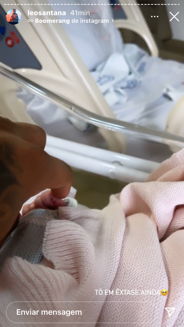 “Linda, a cara do pai”, brincou o cantor. Por volta das 9h30, Léo havia postado uma foto nas redes sociais com a roupa do hospital e com uma touca especial com o nome da filha. O casal anunciou que estava esperando a primeira filha em março.