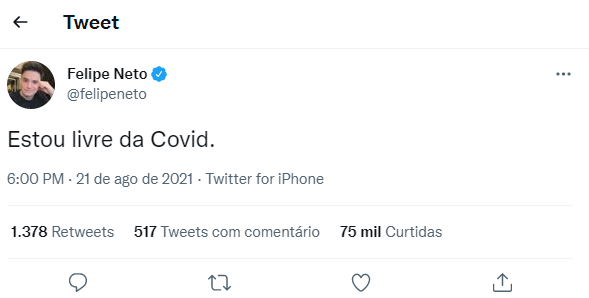 O youtuber Felipe Neto, 33 anos, anunciou estar curado da Covid-19. Por meio do seu perfil no Twitter, o influenciador, que testou positivo para a doença em 11 de agosto (veja aqui), 12 dias após receber a primeira dose da vacina, escreveu no sábado (21): “Estou livre da Covid”.