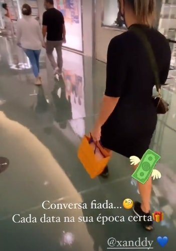Xanddy ficou inconformado com Carla Perez, assim que a esposa saiu de uma loja no shopping com uma sacola. No corredor do local, o cantor filmou alguns stories comentando sobre a compra grifada da amada. “Presente do ano inteiro”, disse o famoso, mostrando a sacola da marca Louis Vuitton. O vídeo foi publicado nos stories da baiana, no Instagram.