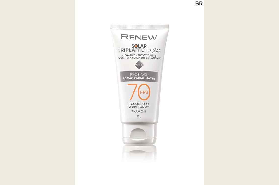Já quem busca aumentar a firmeza e elasticidade da pele, já pode incluir na rotina o Renew Solar FPS 70 com tecnologia Protinol. Com Phytol e Protinol que potencializa a produção de dois tipos de colágeno, a composição preenche as linhas finas e dá sensação de toque seco, com cobertura invisível de longa duração que reduz a aparência dos poros, garantindo um tratamento anti-idade eficaz ao longo da aplicação. Tudo em um só produto!