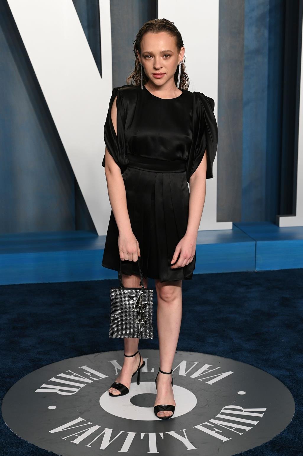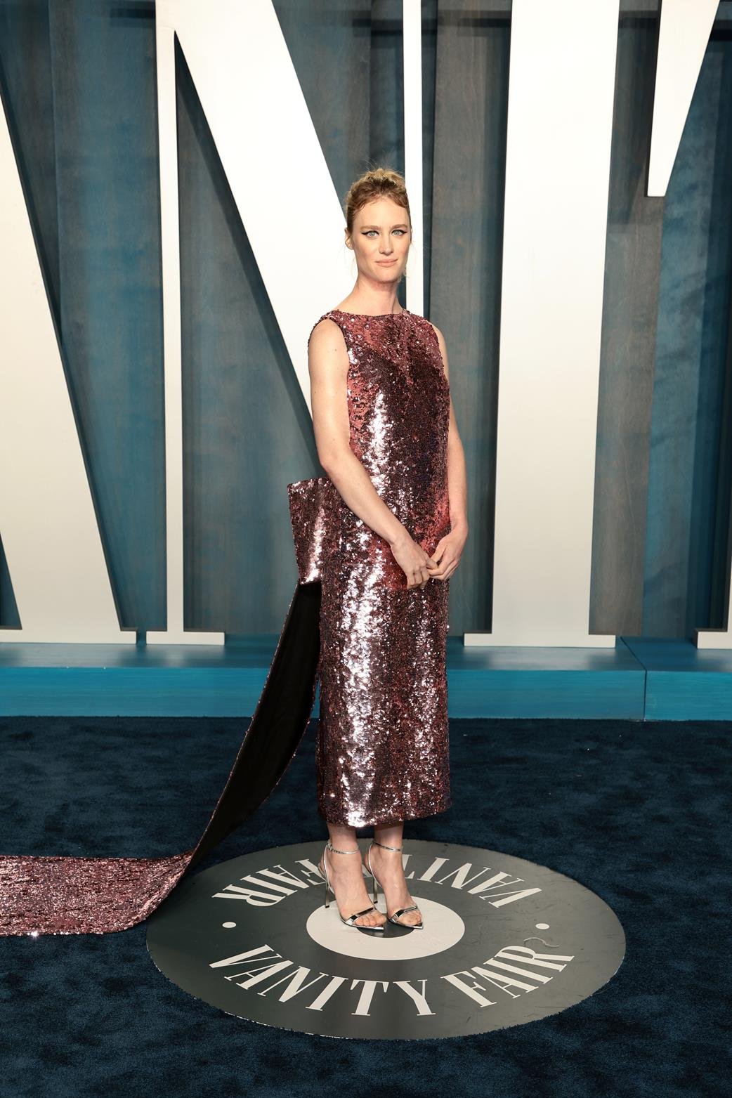 Na festa promovida pela Vanity Fair  Mackenzie Davis optou por um vestido de paetês rosa com laço geométrico e cauda. Além de sandálias de couro prata