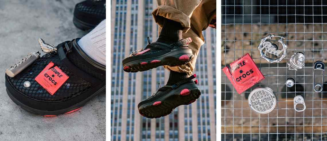 O modelo em edição limitada é uma ode ao pombo-correio, símbolo clássico da Staple, com uma rede que recobre a gáspea do calçado e Jibbitz que exalam a identidade de Nova York: o pombo-correio, uma embalagem de preservativo, um isqueiro, um brinco, uma tampa de garrafa, um tampão do esgoto nova-iorquino e um alfinete.