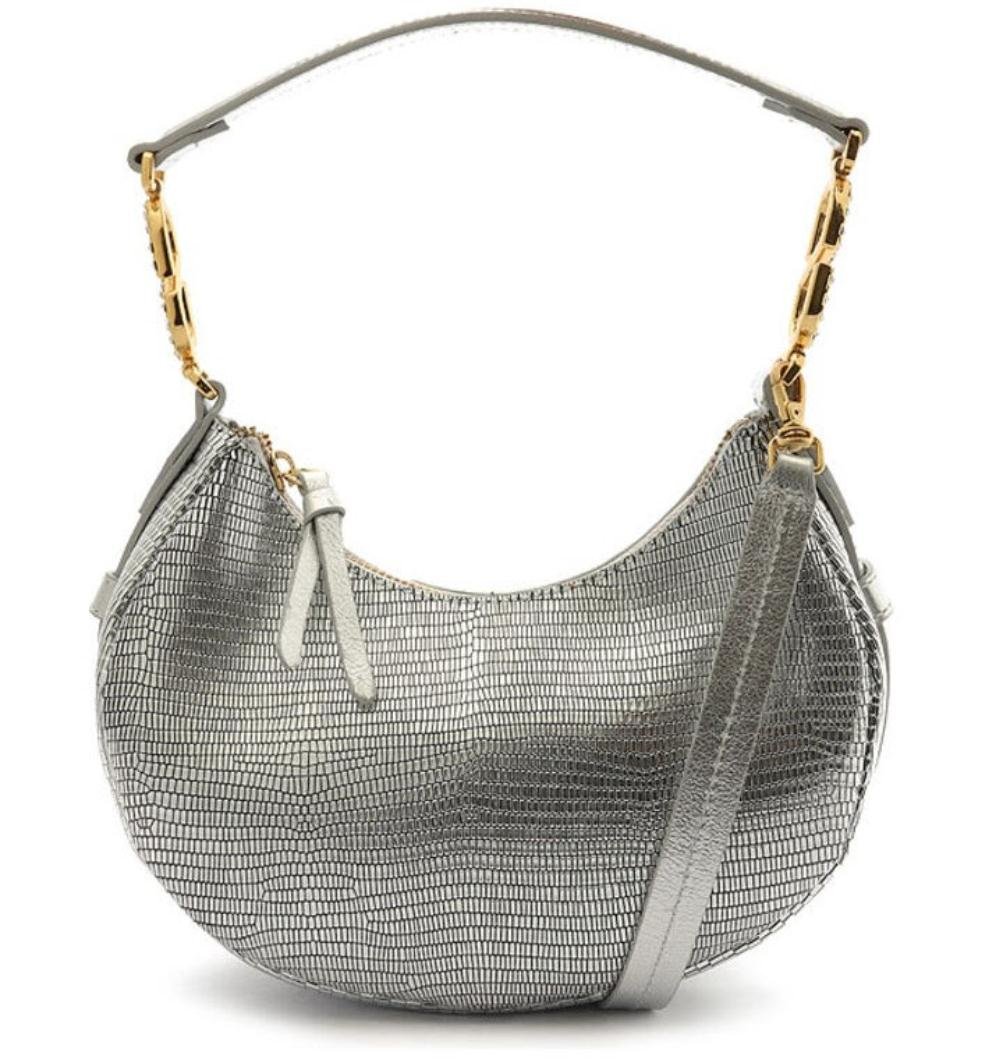 Seguindo a linha de peças que imprimem sofisticação, a bolsa Blake se diferencia pelo formato em halfmoon (meia-lua) e sua textura metalizada em tons de prata e dourado. A alça shoulder conta com um gancho em formato de “S” com aplicação de pedrarias, reforçando sua elegância.