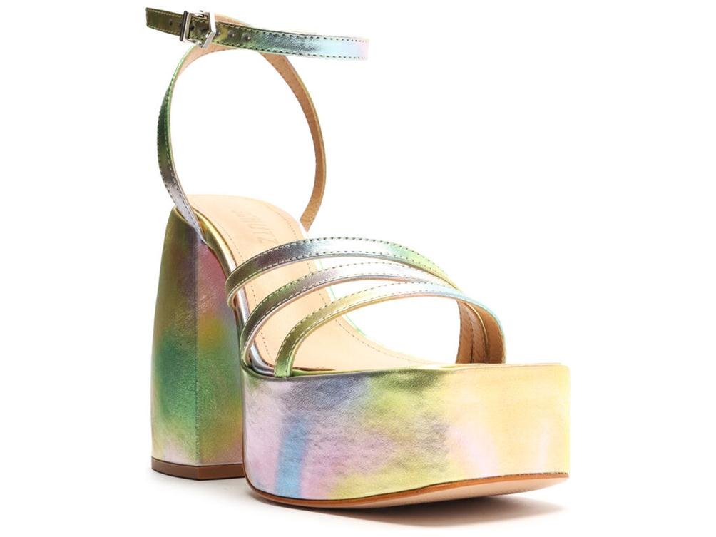 Novidade na marca, a textura holográfica surge em peças exclusivas e traz um toque futurista para a coleção. O mule Aretha aparece nas cores rosa, azul, amarelo e bege, em construção de plataforma de salto blocado e linhas modernas.