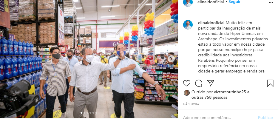 “Muito feliz em participar da inauguração da mais nova unidade do Hiper Unimar, em Arembepe. Os investimentos privados estão a todo vapor em nossa cidade porque nosso município hoje passa credibilidade aos investidores”, escreveu Elinaldo Araújo.