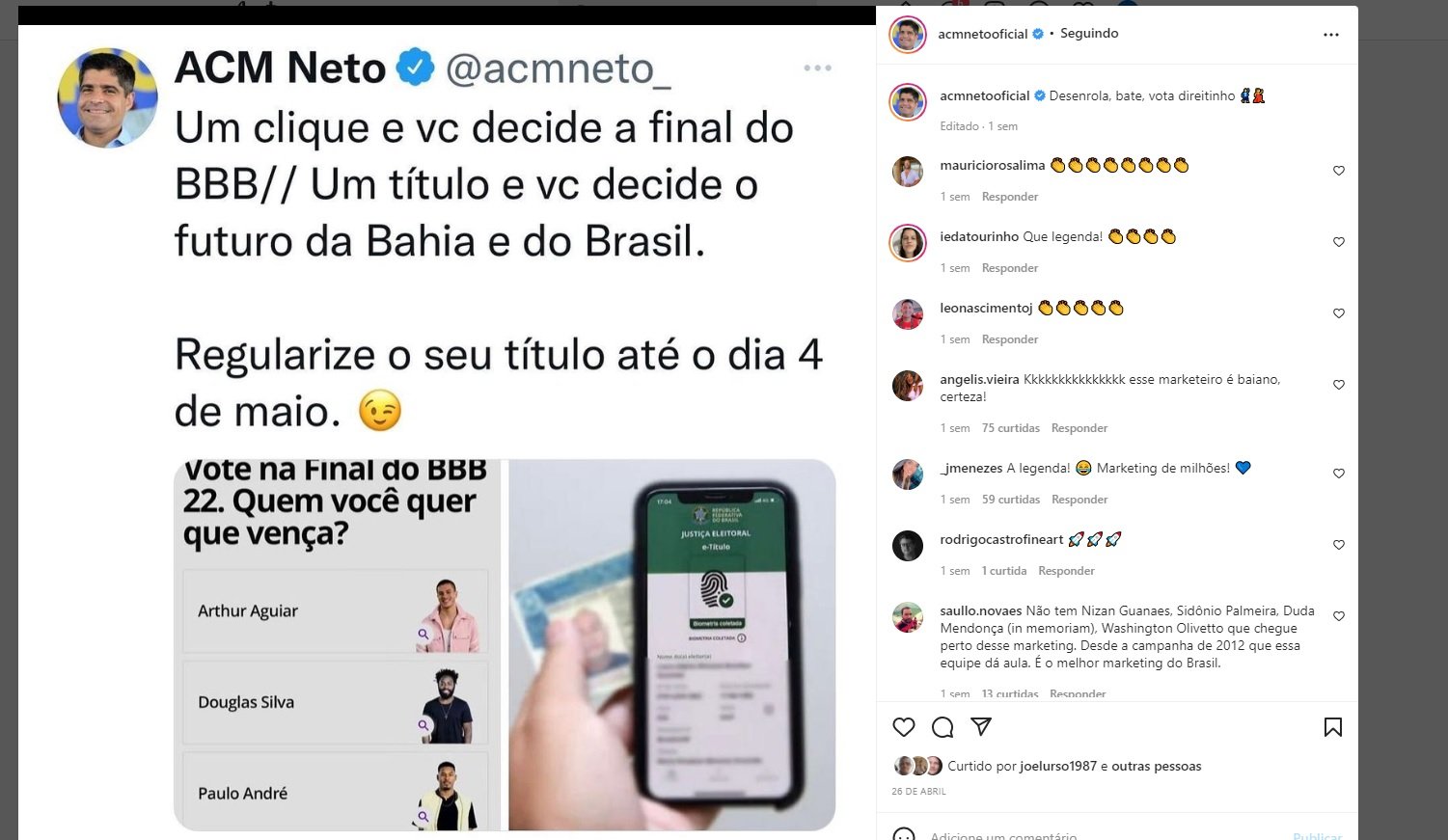A propaganda antecipada deve ser excluída no prazo de até 12 horas sob pena de pagamento de multa diária de R$ 5 mil. Às 19h desta terça-feira (10, o post ainda constava no perfil do Instagram do ex-prefeito de Salvador.