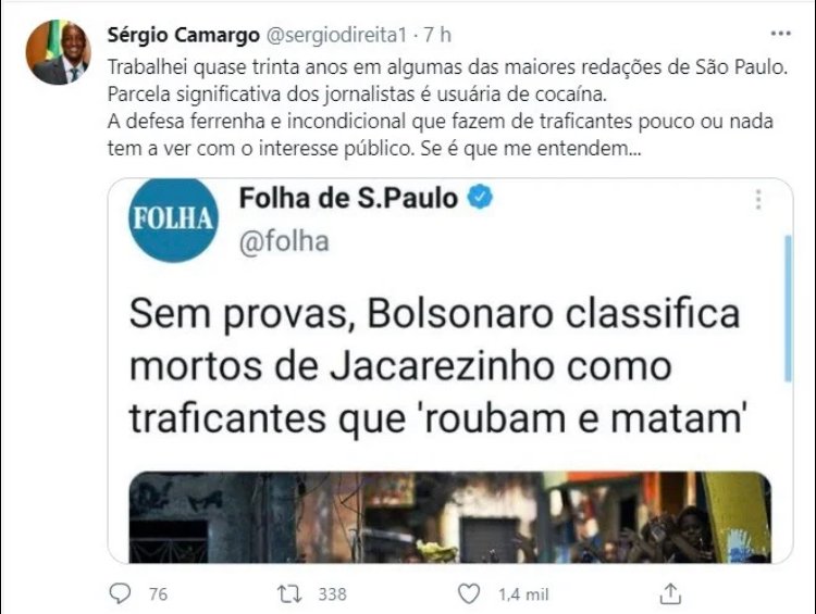 Uma declaração do presidente da Fundação Palmares, Sérgio Camargo, na segunda-feira (10), seguiu uma linha que já se tornou rotineira no atual Governo Federal: ofender os jornalistas. Em crítica a uma matéria da Folha de S. Paulo, sobre a ação policial no Jacarezinho que resultou em 28 mortes, ele disse que a categoria defende traficantes porque uma parcela significativa dos jornalistas é “usuária de cocaína”.