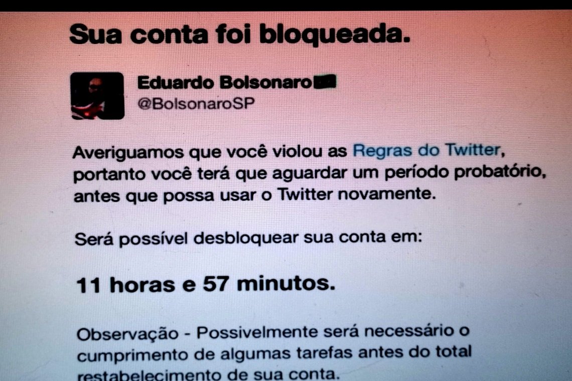 Em uma publicação no Instagram, o filho ‘zero três’ do presidente Jair Bolsonaro (PL) publicou a mensagem que recebeu da rede social notificando o bloqueio: “Averiguamos que você violou as regras do Twitter, portanto você terá que aguardar um período probatório, antes que possa usar o Twitter novamente”.