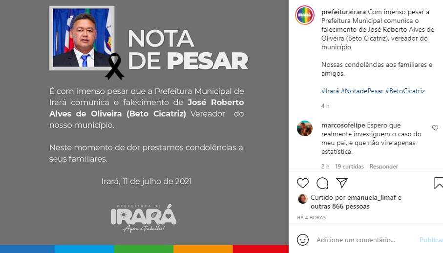 “É com imenso pesar que a Prefeitura Municipal comunica o falecimento de José Roberto Alves de Oliveira (Beto Cicatriz), vereador do município. Neste momento de dor, prestamos condolências a seus familiares”, declarou a prefeitura de Irará, em nota nas redes sociais.