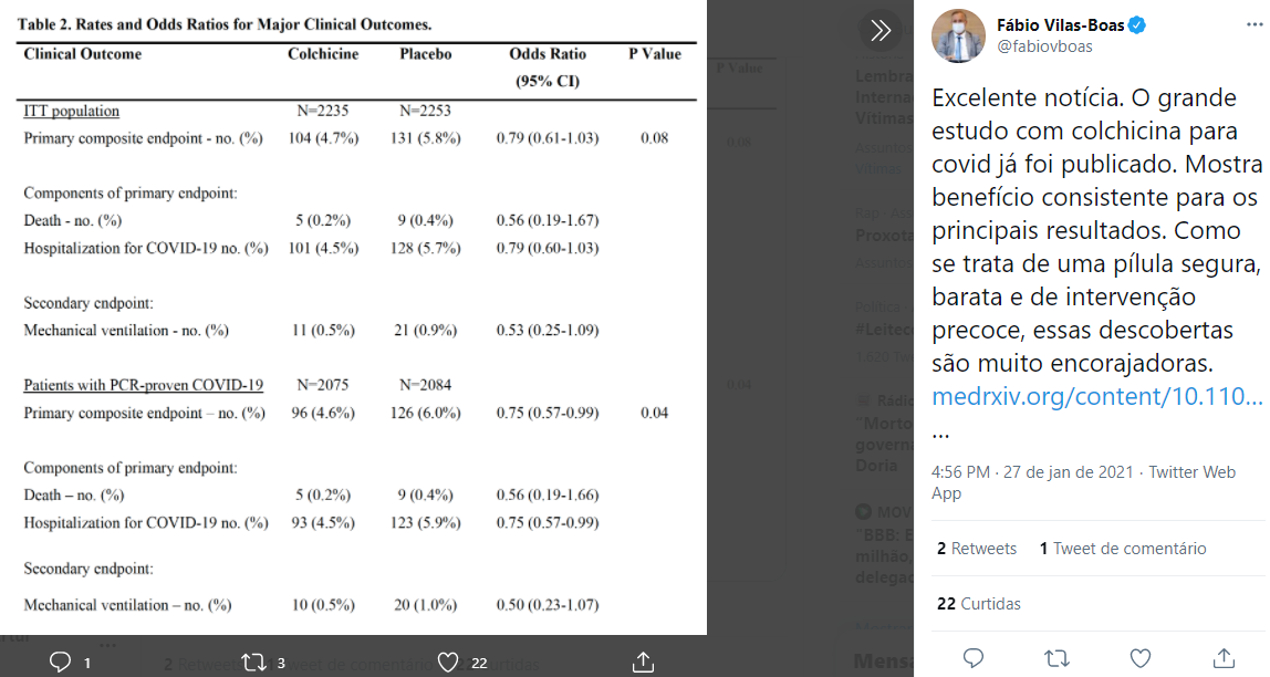 “Excelente notícia. O grande estudo com colchicina para covid já foi publicado. Mostra benefício consistente para os principais resultados. Como se trata de uma pílula segura, barata e de intervenção precoce, essas descobertas são muito encorajadoras”, escreveu o titular da Sesab, no Twitter.