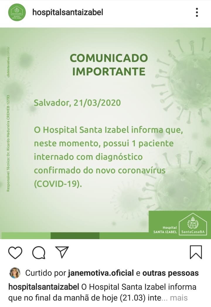 O Hospita Santa Izabel anunciou neste sábado (21) que a unidade trata de um paciente com o novo coronavírus. Como no boletim de ontem da Secretaria de Saúde do Estado (Sesab), a cidade tinha 18 casos confirmados da covid-19, trata-se do 19º registro da doença em Salvador, 35º em todo o estado. A Bahia possui infectados em Feira de Santana (6); Porto Seguro (4); Lauro de Freitas (3); e em Prado, Itabuna e Camaçari (1 em cada).