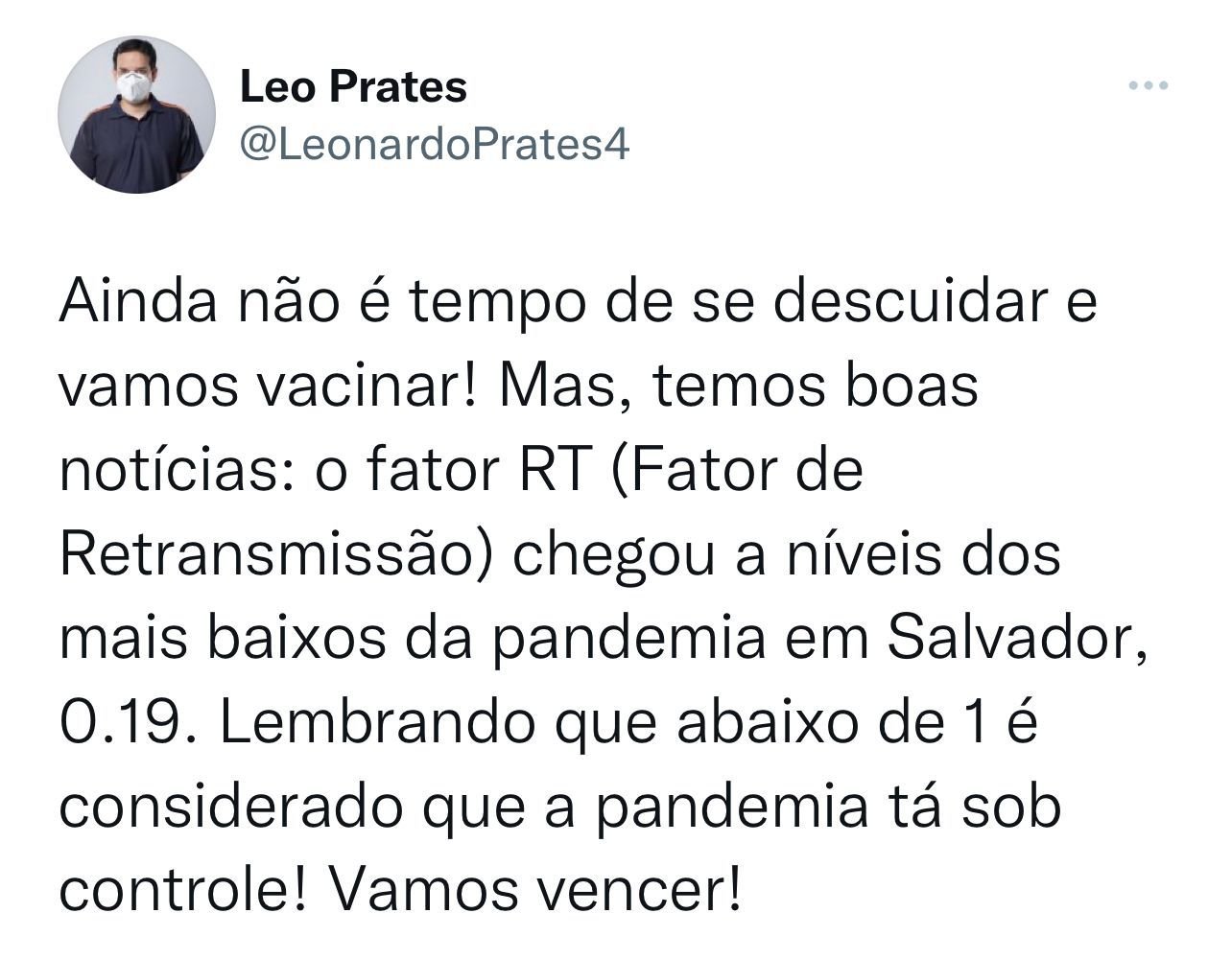 “Ainda não é tempo de se descuidar e vamos vacinar! Mas, temos boas notícias: o fator RT (Fator de Retransmissão) chegou a níveis dos mais baixos da pandemia em Salvador, 0.19. Lembrando que abaixo de 1 é considerado que a pandemia tá sob controle! Vamos vencer!”, postou ele no twitter. Confira: