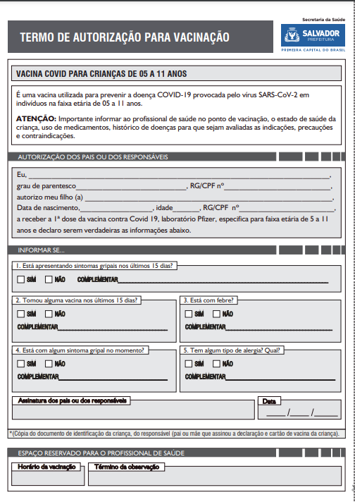 Contudo, para receber o imunizante, a criança vai precisar que o pai ou responsável entregue um documento preenchido autorizando a vacinação. O documento está disponível no site da Secretaria Municipal da Saúde. Porém, também é possível fazer a autorização de próprio punho, assinada e concordando com a aplicação. O documento é uma orientação do Ministério da Saúde.